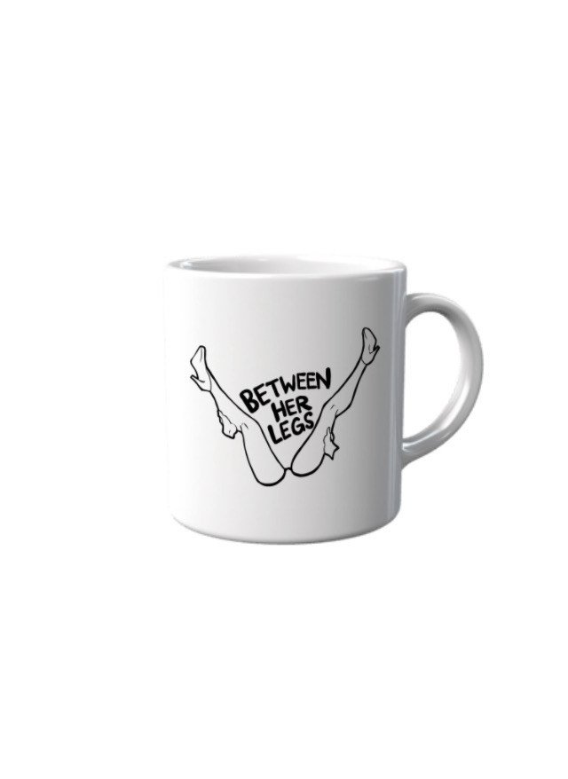 White ceramic mug featuring the Between Her Legs logo. Everyday drinkware designed for home or office use.